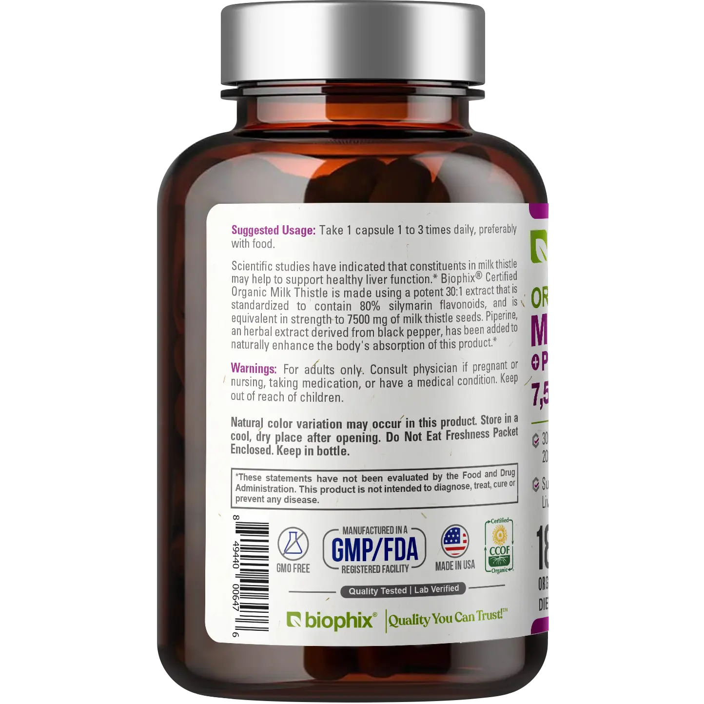 Introducing USDA Organic Milk Thistle! Our Certified Organic Milk Thistle is made using a potent 30:1 extract standardized to contain 80% silymarin flavonoids, equivalent in strength to 7,500 mg of milk thistle seeds. To further enhance this formula, we’ve added Organic Piperine, an herbal extract derived from black pepper, which naturally boosts the body's absorption of this product. Each capsule delivers a full dose of 200 mg of Silymarin Flavonoids, ensuring consistent potency.
