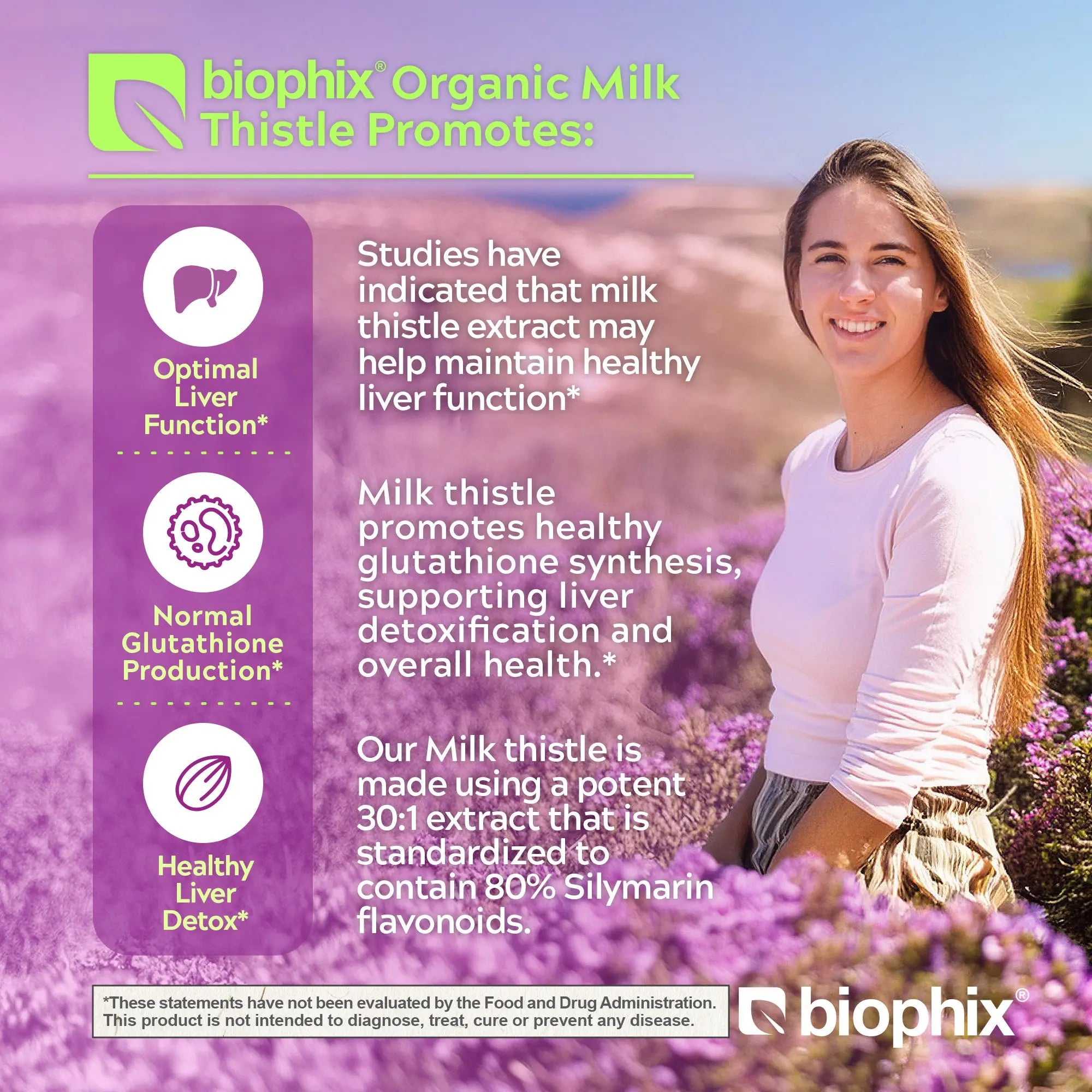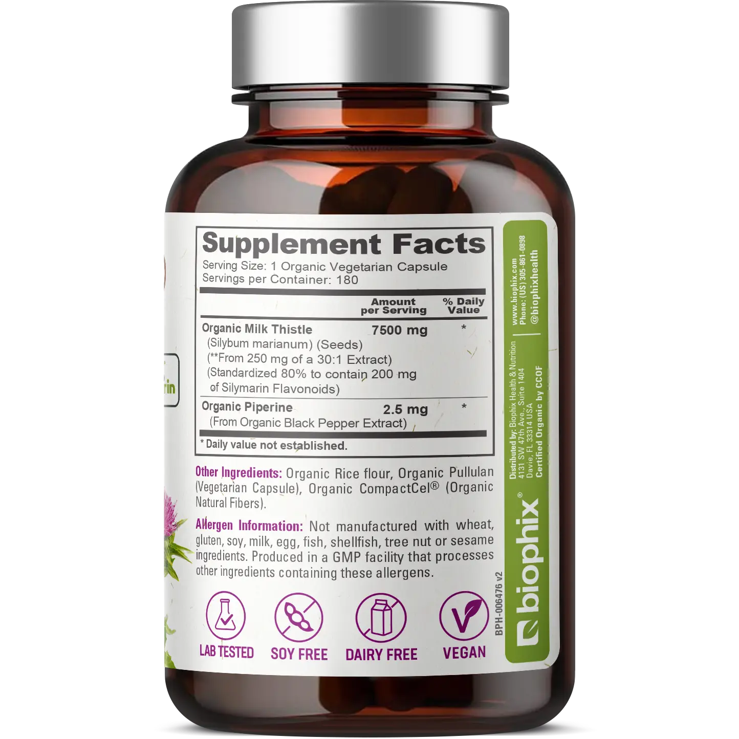 We pride ourselves on using only the finest Organic Milk Thistle extract, free from unnecessary additives, GMOs, and pesticides, ensuring a clean and wholesome product. Manufactured with care in the USA in our own cGMP certified facility, our product is backed by over 25 years of experience and cGMP certification, guaranteeing strict quality control measures. Rigorous third-party lab testing ensures purity, potency, and safety, giving you peace of mind with every serving. Soy-free, dairy-free, GMO-free, and suitable for vegans, our formula caters to various dietary preferences and restrictions. Trust Biophix Organic Milk Thistle for premium quality and unparalleled support for your health journey!