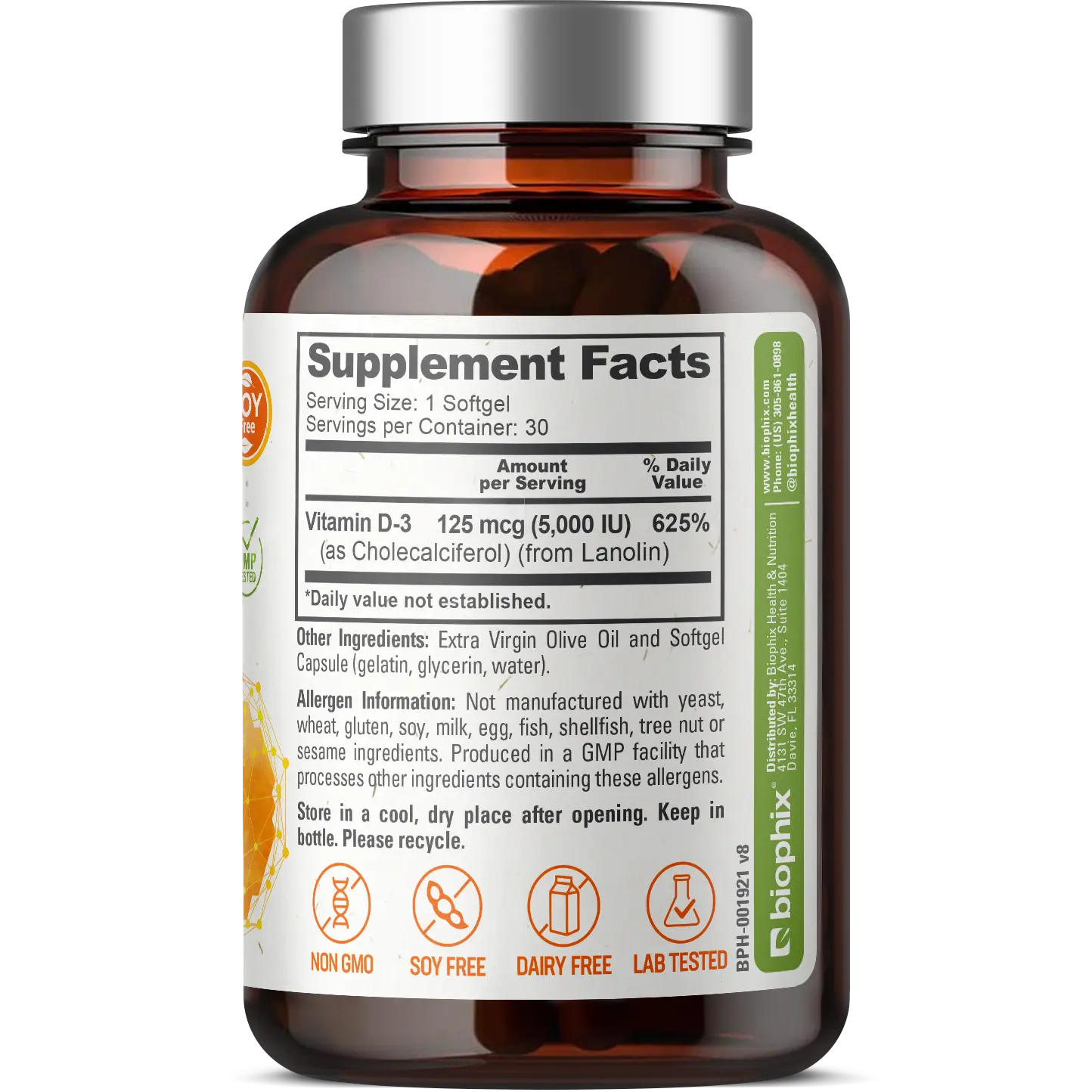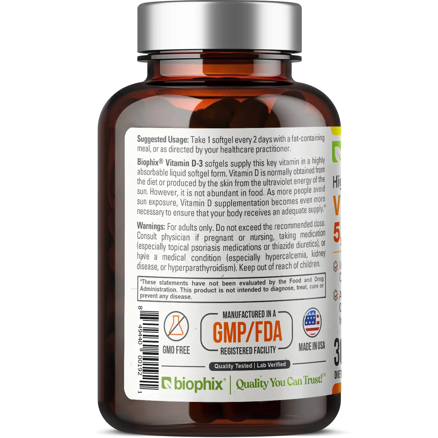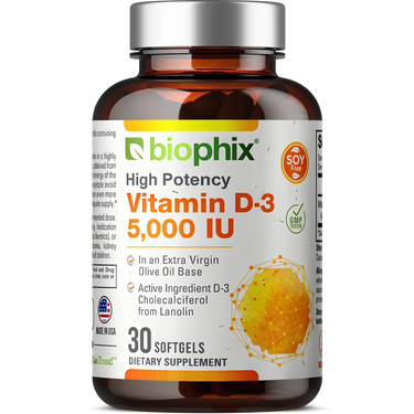 Biophix Vitamin D-3 softgels supply this key vitamin in a highly-absorbable liquid softgel form. Vitamin D is normally obtained from the diet or produced by the skin from the ultraviolet energy of the sun. However, it is not abundant in food. As more people avoid sun exposure, Vitamin D supplementation becomes even more necessary to ensure that your body receives an adequate supply.