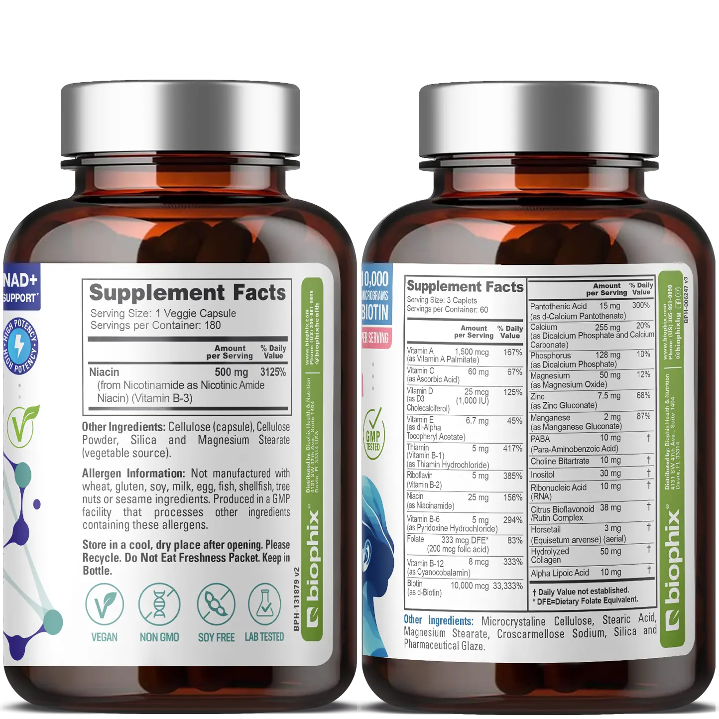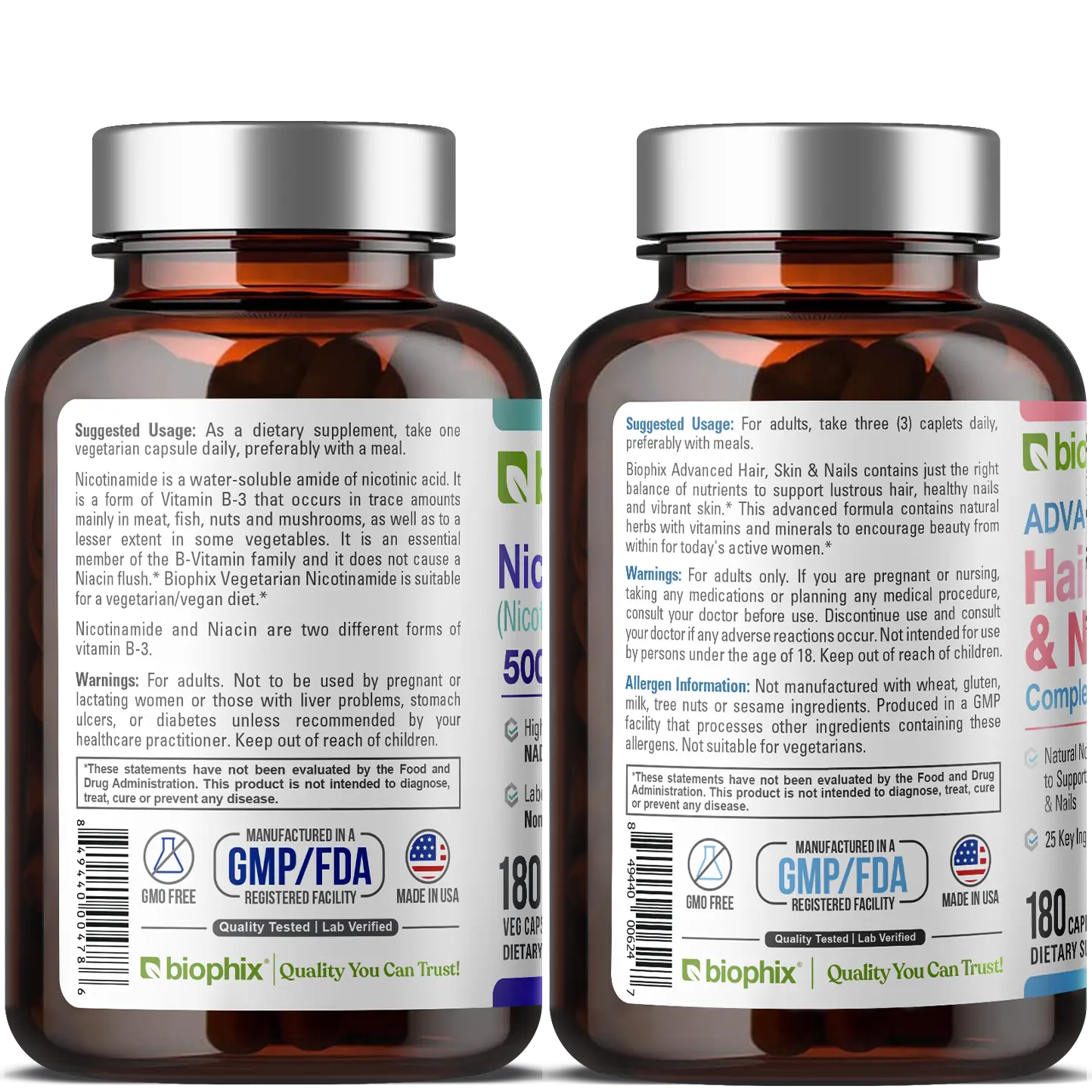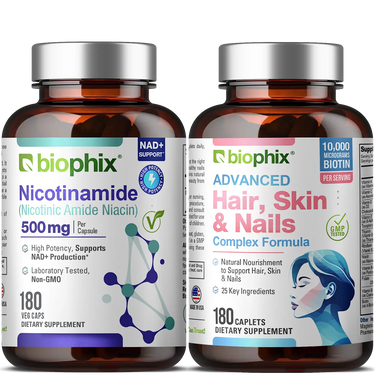 Our Nicotinamide supplement is crafted with care and adheres to high-quality standards. Manufactured in a cGMP facility in the USA, our product is made by a Natural Products Association member, and is Organic Certified by ECOCERT and CCOF. Biophix® Hair, Skin & Nails formula provides a balanced mix of nutrients, natural herbs, vitamins, and minerals. This formula is designed for overall well-being and is suitable for daily use.