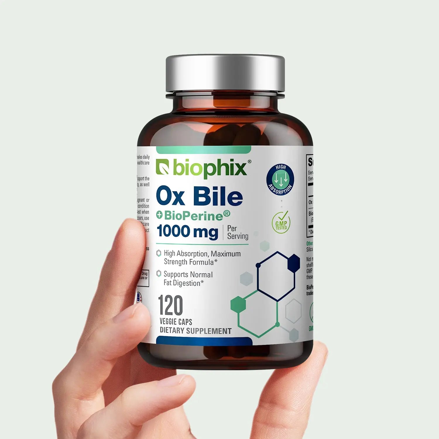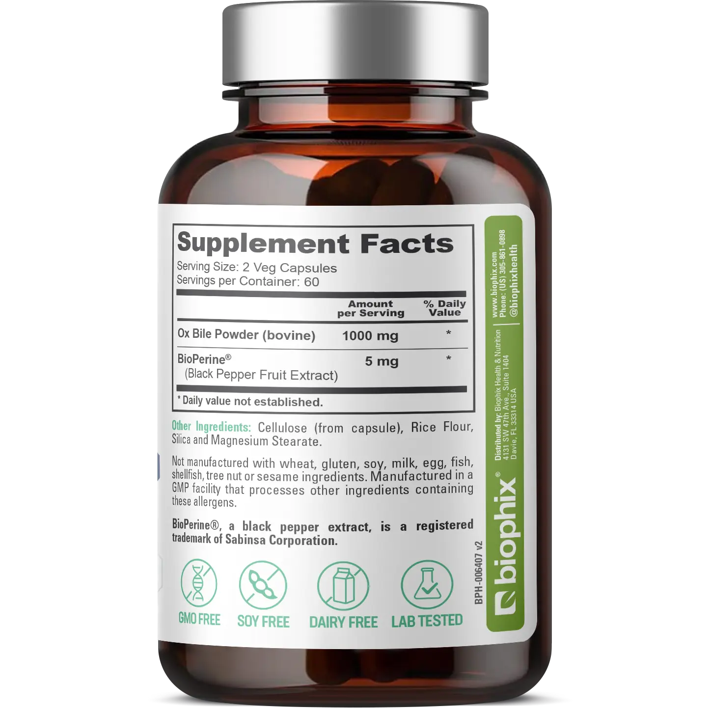 Discover digestive support with Biophix Ox Bile, scientifically formulated to support the body's natural bile production for optimal fat digestion.* This high-absorption, maximum-strength formula is designed to support healthy liver function, promote the effective breakdown of dietary fats, and support the absorption of essential fat-soluble vitamins like A, D, E, and K. With the addition of BioPerine, a black pepper extract, this supplement ensures improved nutrient absorption and maximized effectiveness, delivering the support you need in every capsule.*