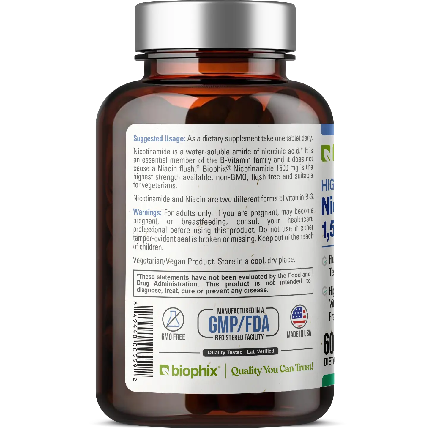 Biophix® Nicotinamide is crafted with care, ensuring a pure and natural supplement. Our product is made in the USA, adhering to strict quality standards, and is certified organic by ECOCERT and FDA registered.