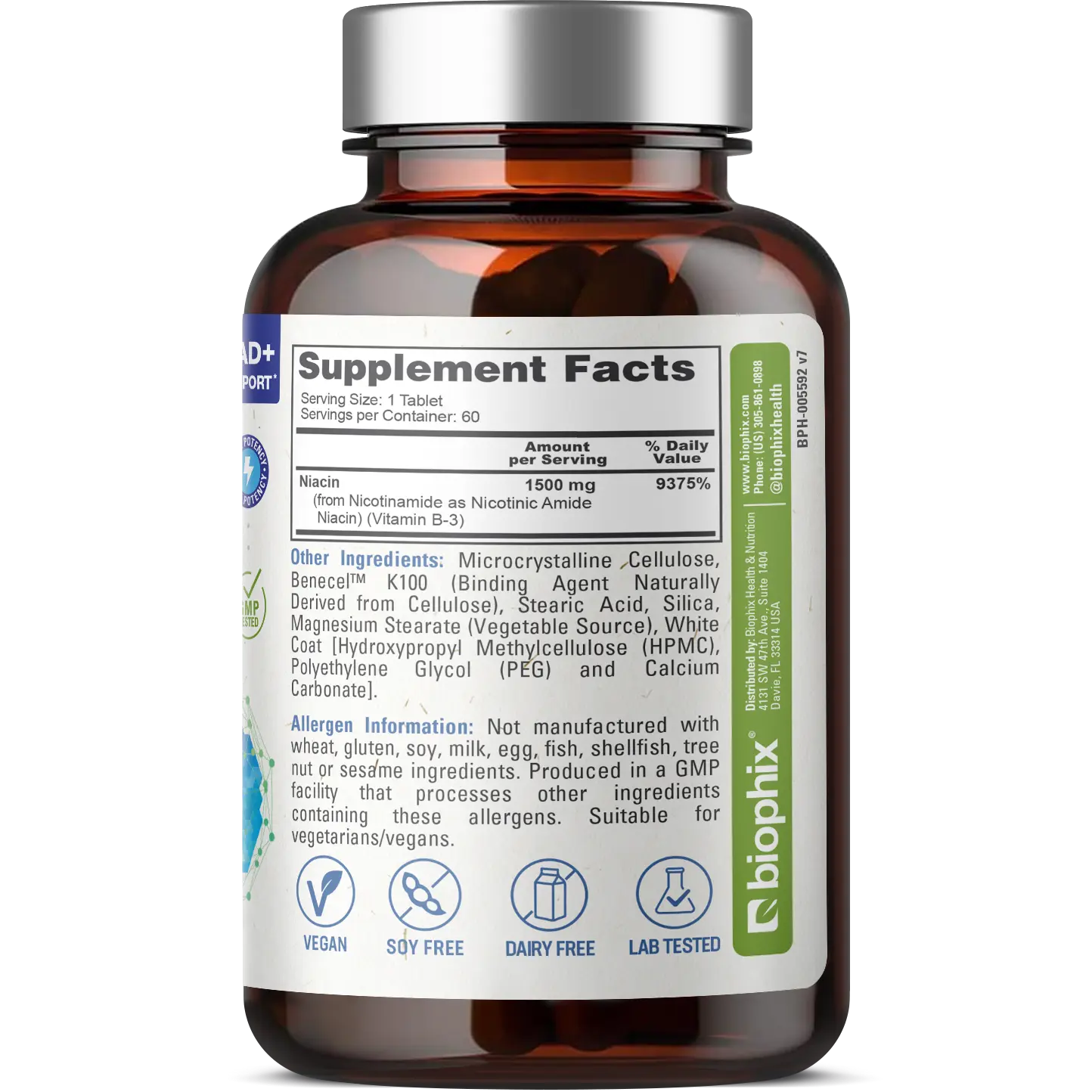 Biophix® Nicotinamide, a water-soluble form of vitamin B3, is derived from high-quality dietary sources. Found naturally in legumes, beans, nuts, seeds, and green leafy vegetables, nicotinamide supports various metabolic processes in the body. Our Nicotinamide supplement provides an easy way to include this essential nutrient in your daily regimen.