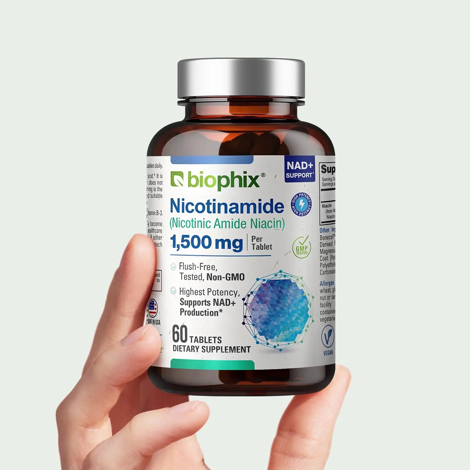 Biophix® Nicotinamide is crafted with care, ensuring a pure and natural supplement. Our product is made in the USA, adhering to strict quality standards, and is certified organic by ECOCERT and FDA registered.