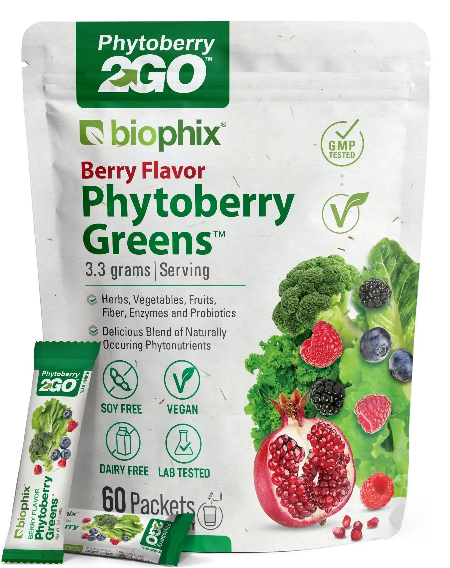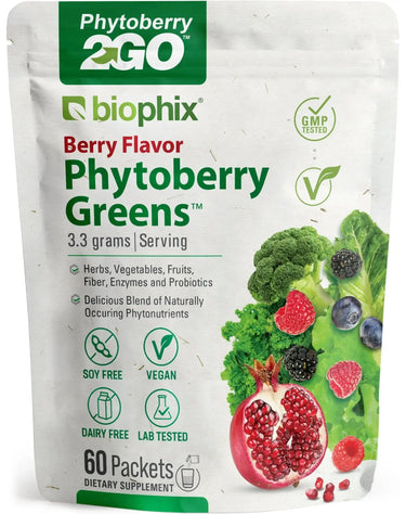 Biophix Phytoberry2GO Greens is a high-quality superfood powder that contains a unique blend of fruits, vegetables, probiotics, organic foods, digestive fibers, Trace Minerals, Resveratrol, Apple Pectin and more, to support overall health and well-being. This potent formula is packed with antioxidant support nutrients, naturally occurring vitamins, and minerals, formulated for optimal nourishment and healthy immune system support.