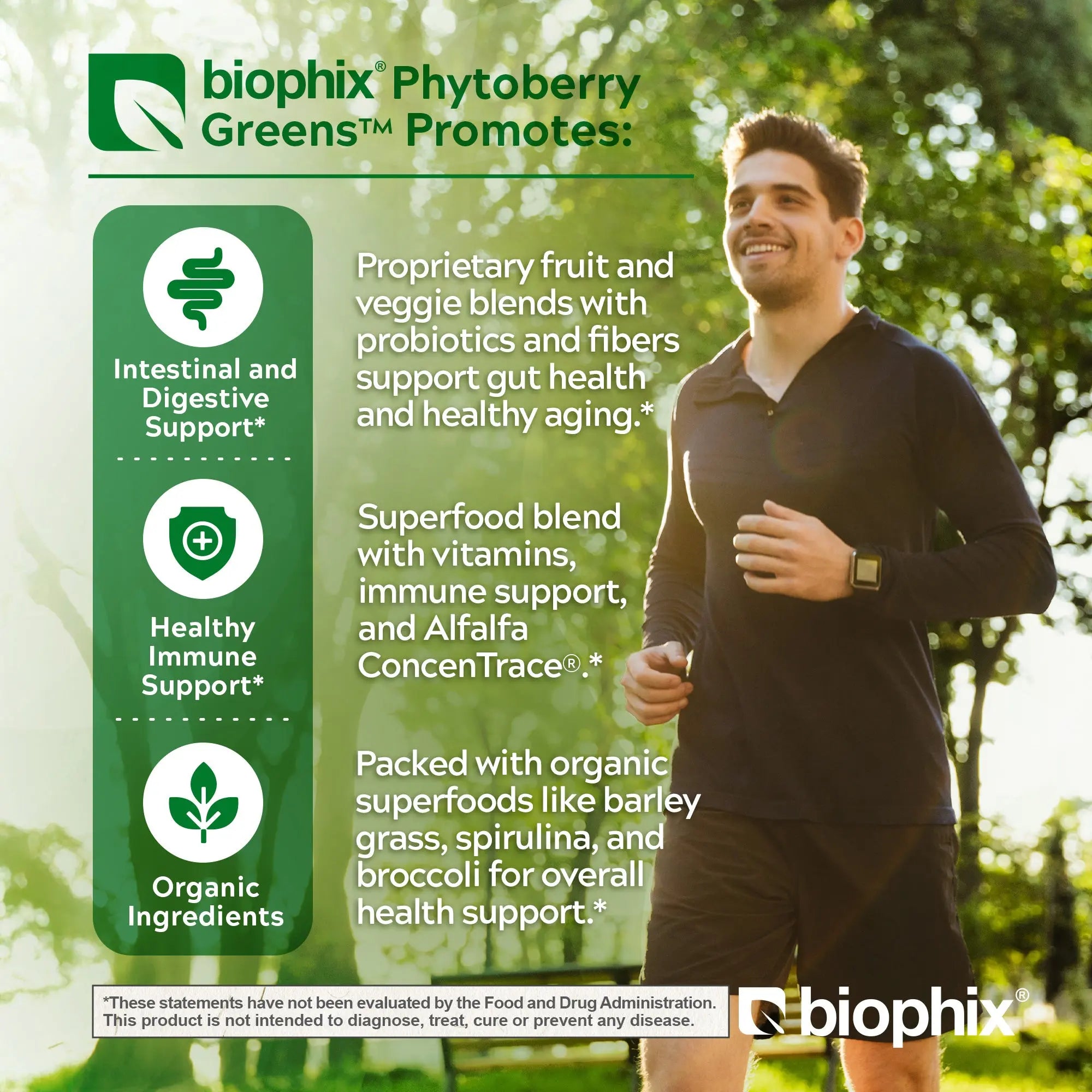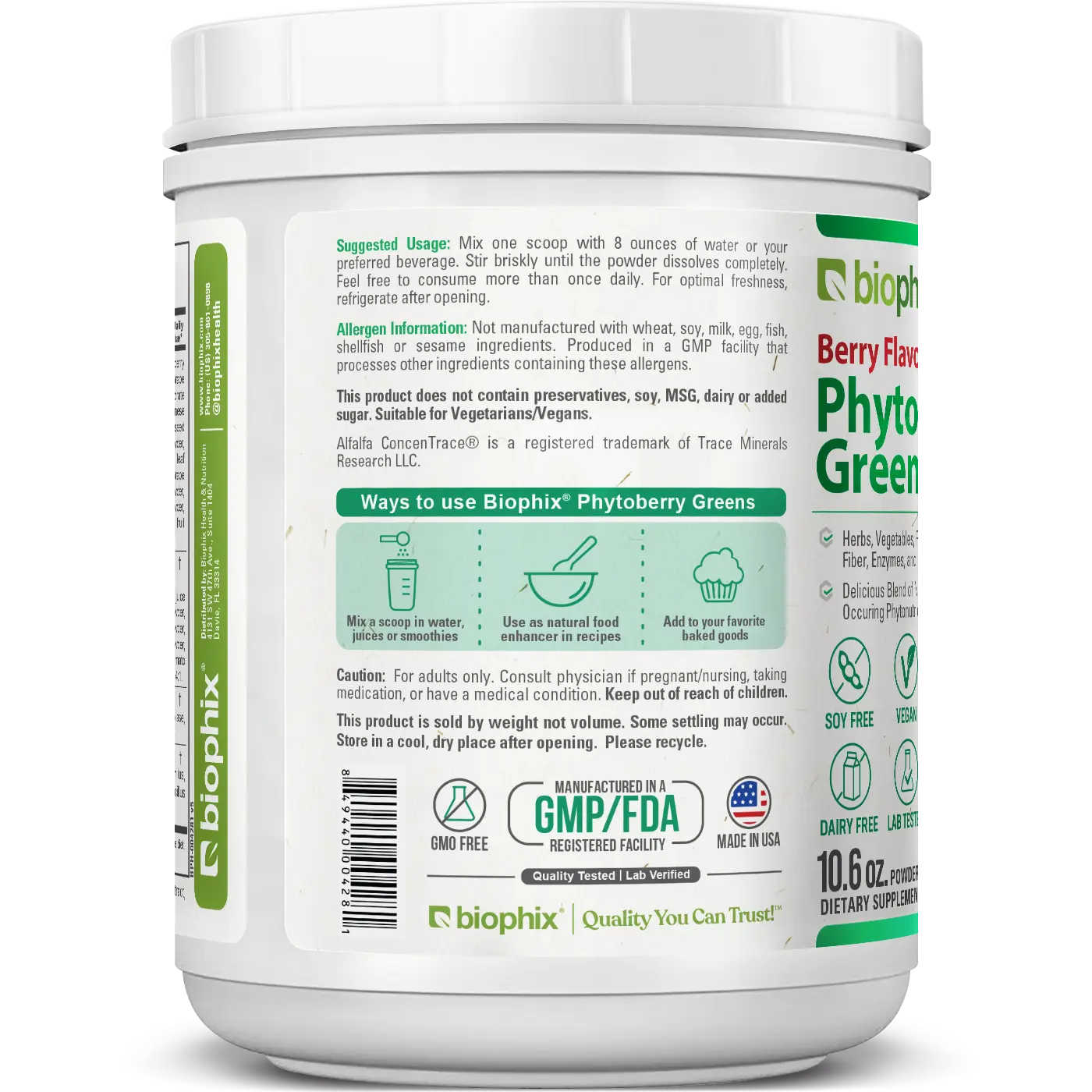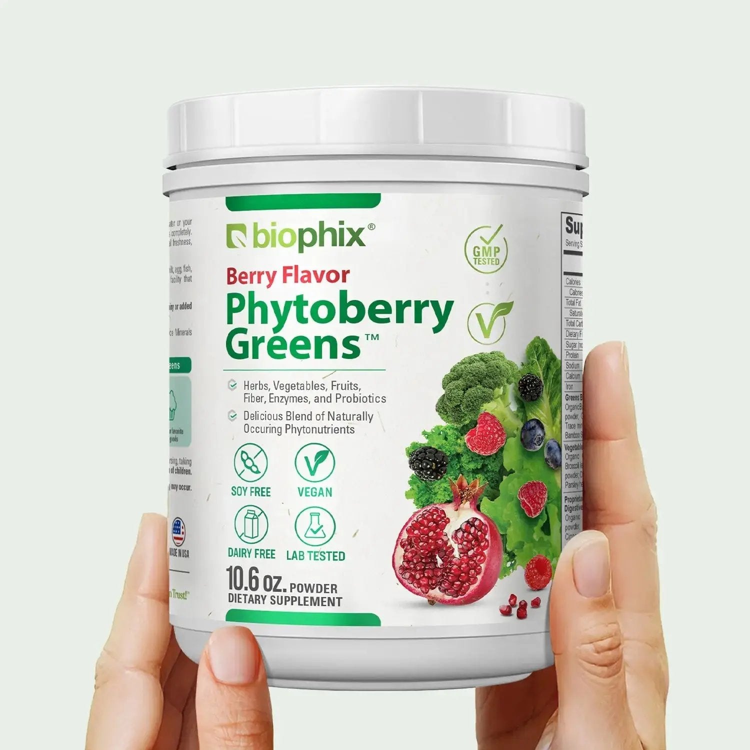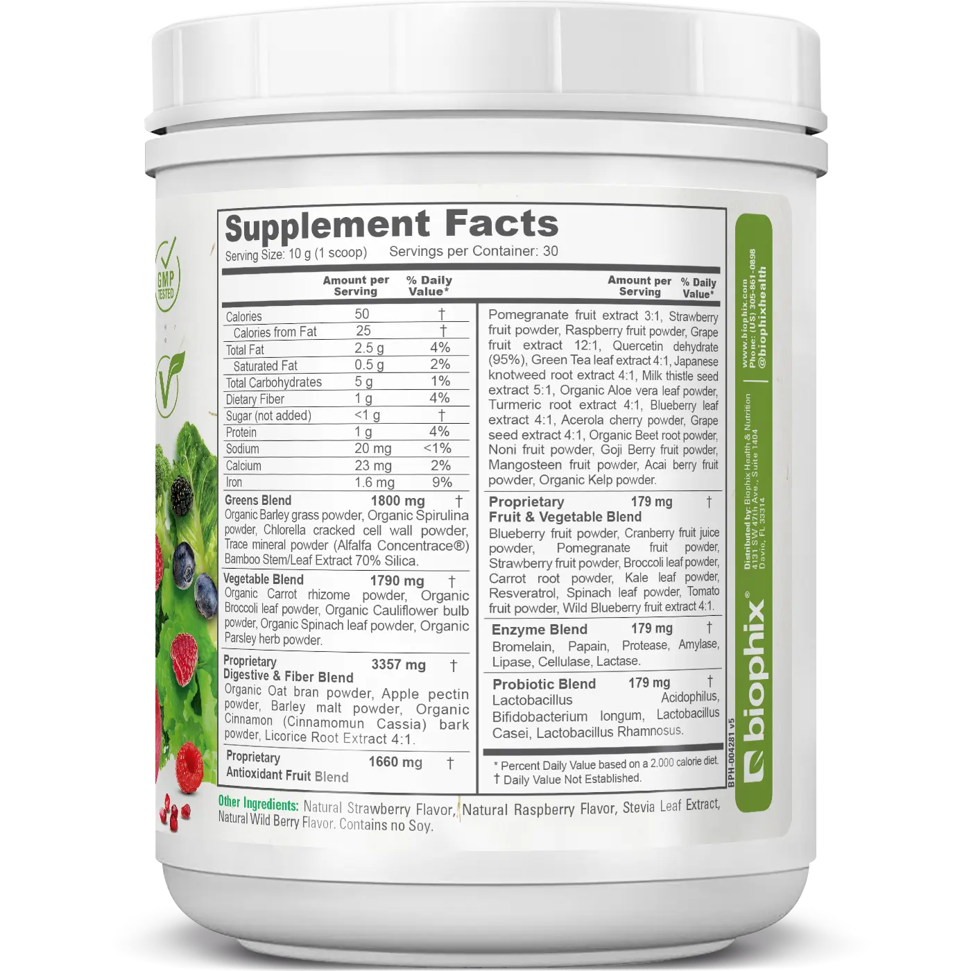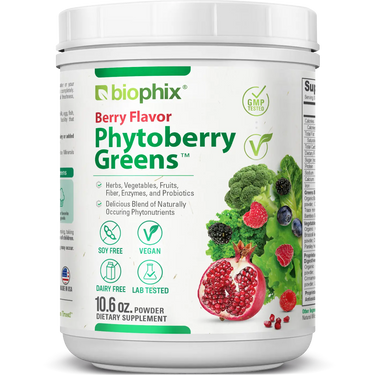 Biophix® Phytoberry Greens is a high-quality superfood powder that contains a unique blend of fruits, vegetables, probiotics, organic foods, digestive fibers, Trace Minerals, Resveratrol, Apple Pectin and more, to support overall health and well-being. This potent formula is packed with antioxidant support nutrients, naturally occurring vitamins, and minerals, formulated for optimal nourishment and healthy immune system support.