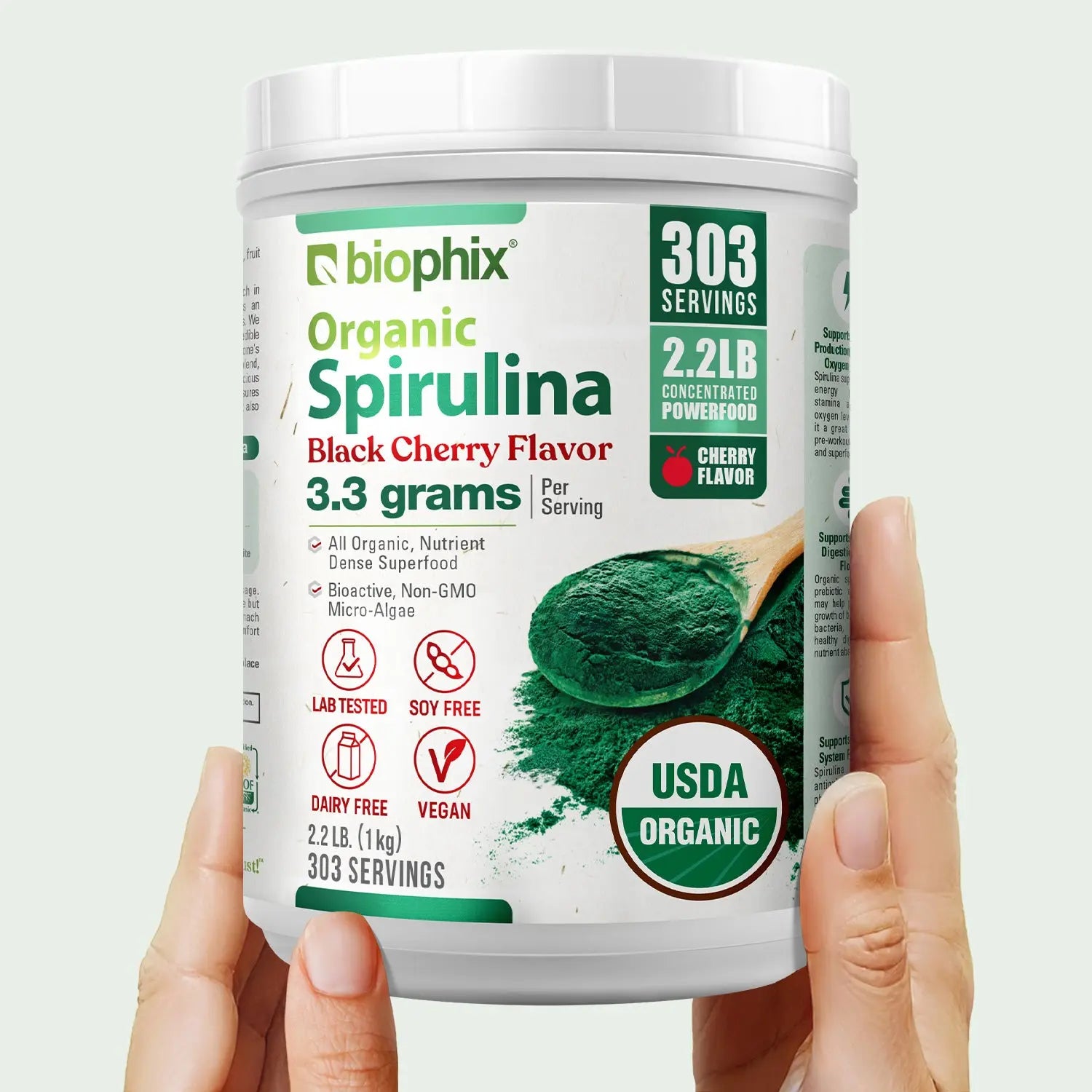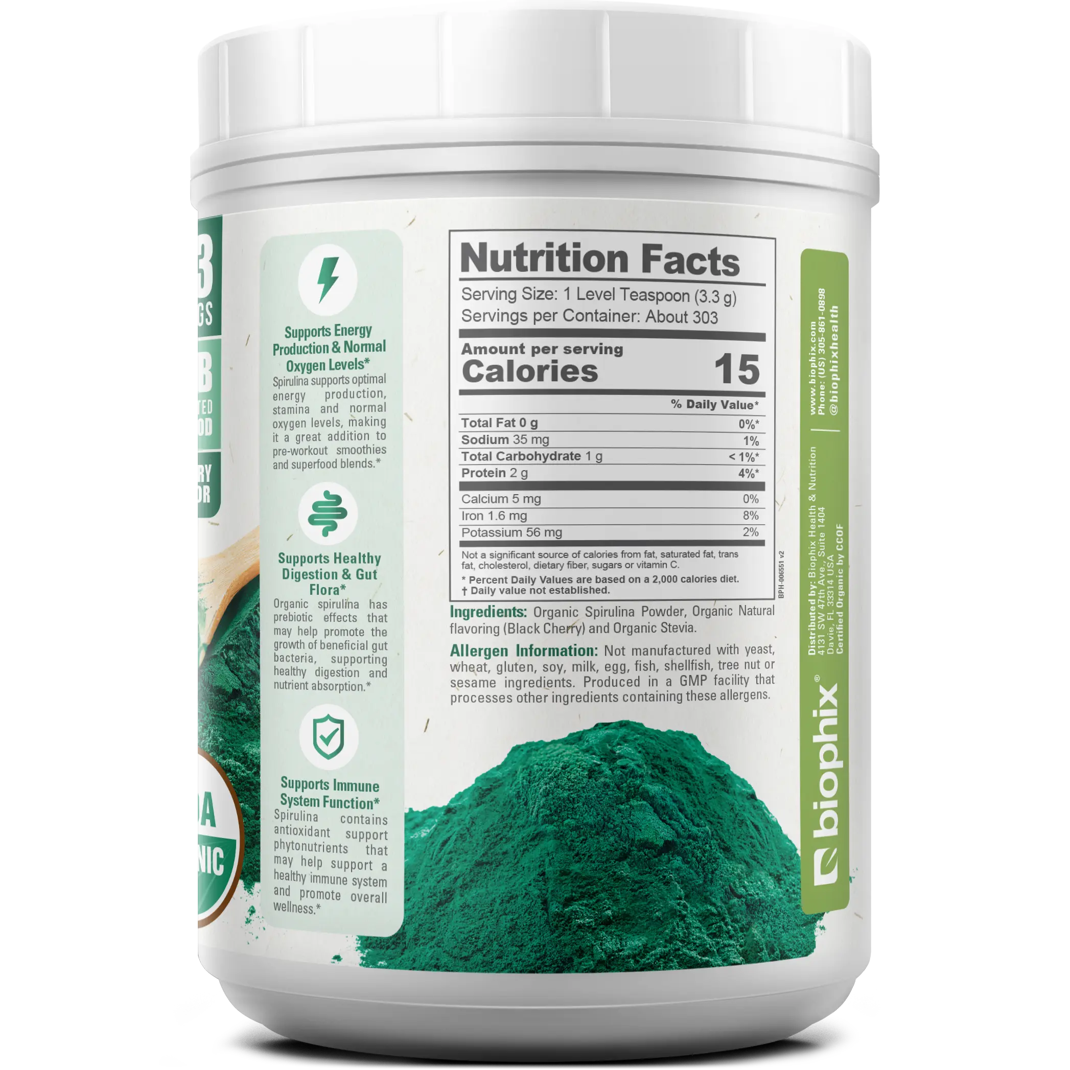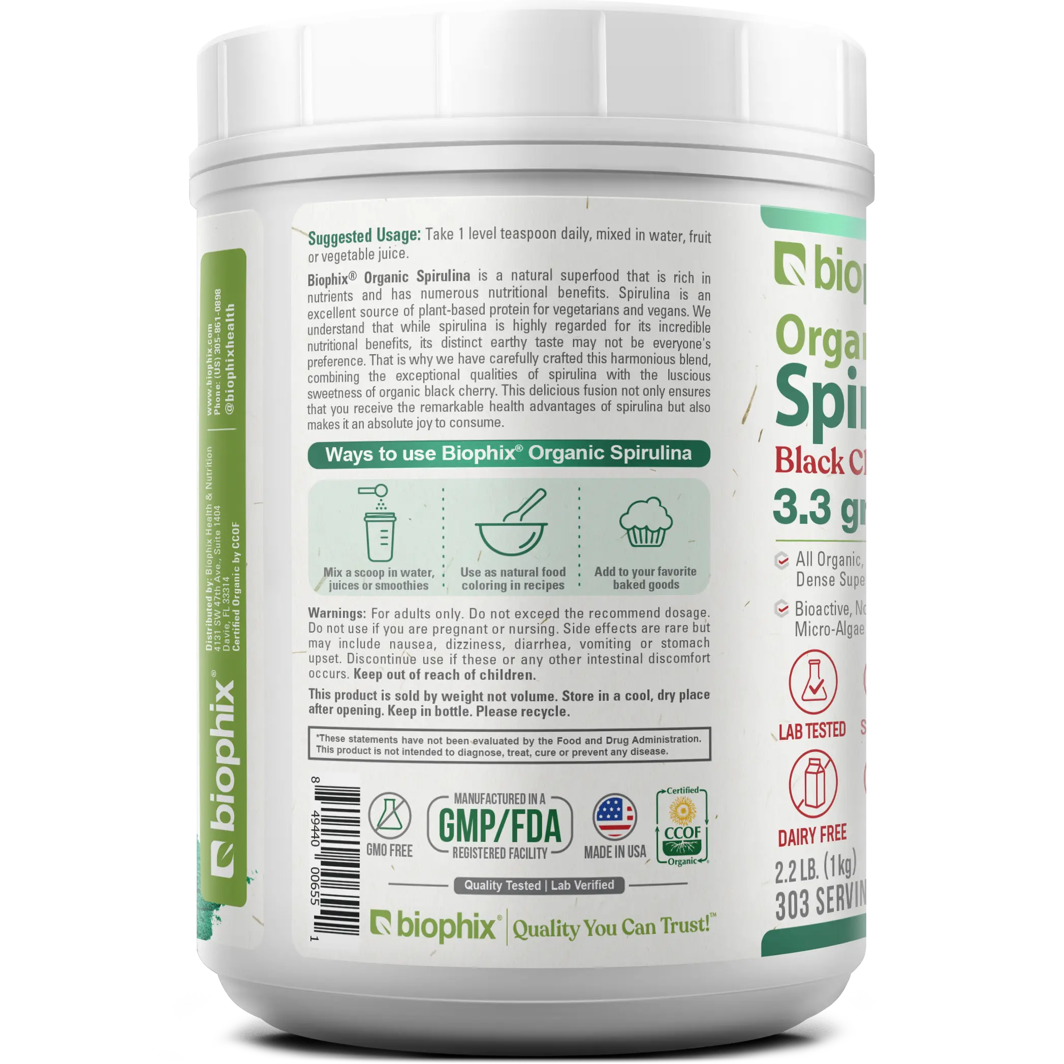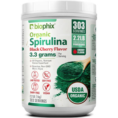 Introducing the first naturally flavored, great tasting 100% Organic Spirulina ever produced. Biophix Organic Cherry Flavored Spirulina is a natural superfood that is rich in nutrients and has numerous nutritional benefits. Spirulina is an excellent source of plant-based protein for vegetarians and vegans. It is also packed with naturally occurring vitamins, minerals and phytonutrients, making it a powerful, nutritious superfood. Our Organic Spirulina powder is carefully sourced and processed to ensure that it retains all its essential nutrients and is free from harmful contaminants. Our family-sized jar, containing 1 KG (2.2 LBS), provides at a total of 303 servings, ensuring a minimum 6-month supply of this incredibly delicious superfood. Made with 100% pure organic ingredients, Biophix Cherry flavored Spirulina is a low-calorie, vegan-friendly drink that is free from allergens and GMO's. We understand that while spirulina is highly regarded for its incredible nutritional benefits, its distinct earthy taste may not be everyone's preference. That is why we have carefully crafted this harmonious blend, combining the exceptional qualities of organic spirulina with the luscious sweetness of organic black cherry flavor. This delicious fusion not only ensures that you receive the remarkable health advantages of spirulina but also makes it an absolute joy to consume! Biophix Organic Spirulina is manufactured in the USA, in our own cGMP-certified facility to ensure maximum quality, purity and potency. We are committed to providing customers with high-quality supplements that are backed by rigorous testing and scientific research.