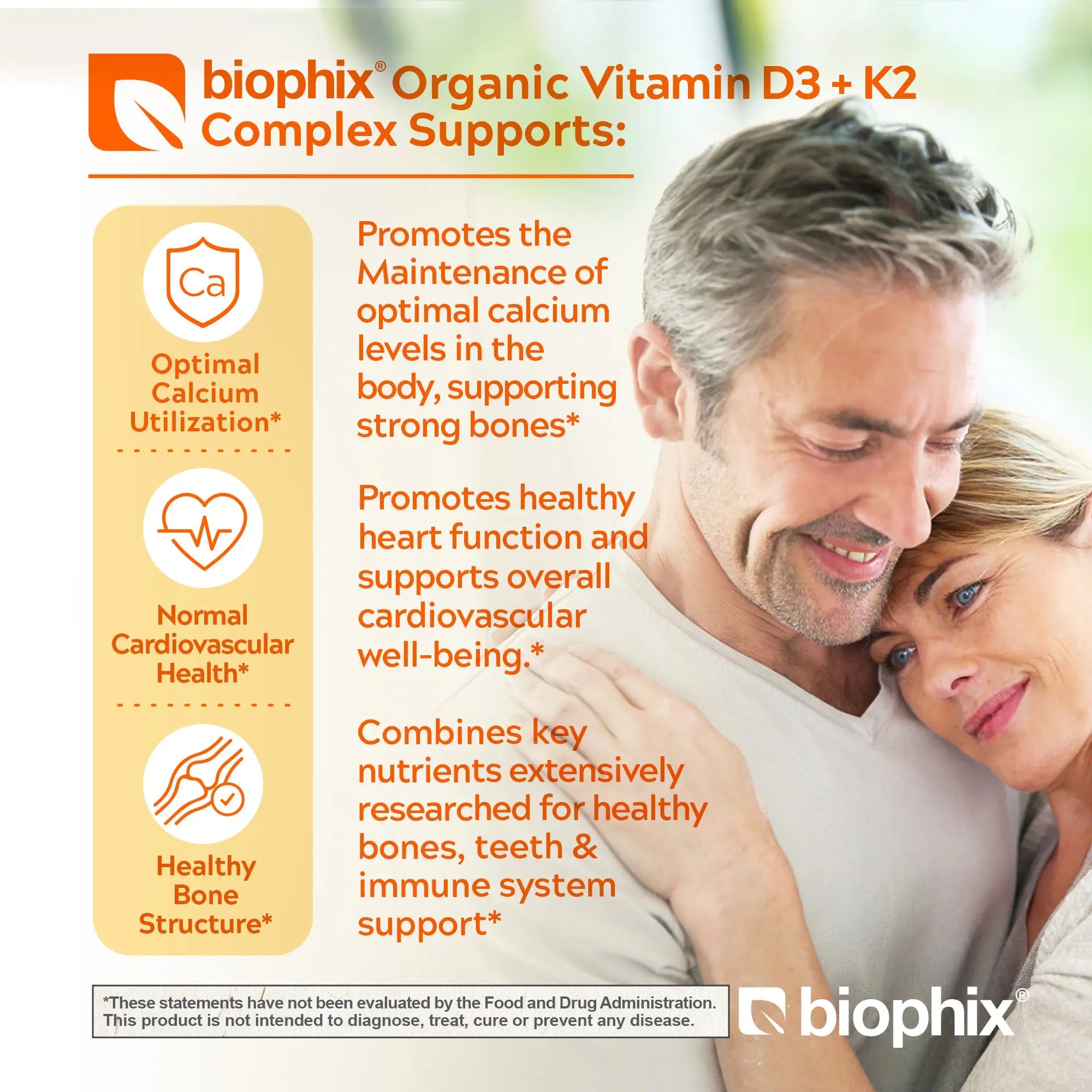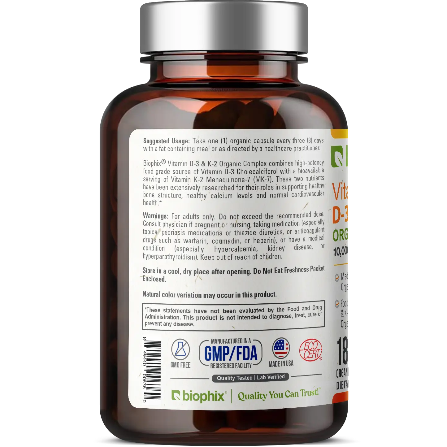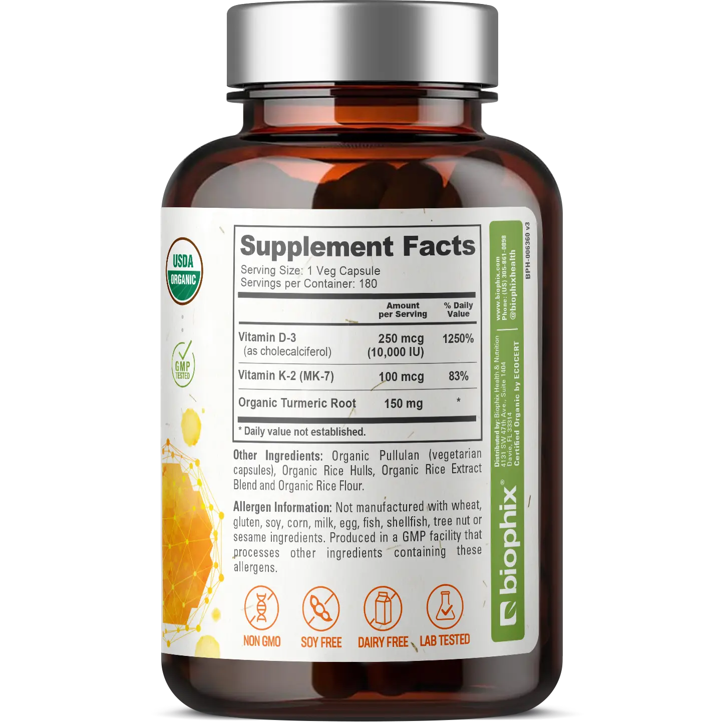 Natural Nutrient Blend: Biophix® Vitamin D-3 and K-2 (MK-7) Organic Complex combines organic Vitamin D-3, K-2 (MK-7), and Turmeric. This clean, organic formula is designed for daily nutritional support without artificial colors, flavors, or preservatives.