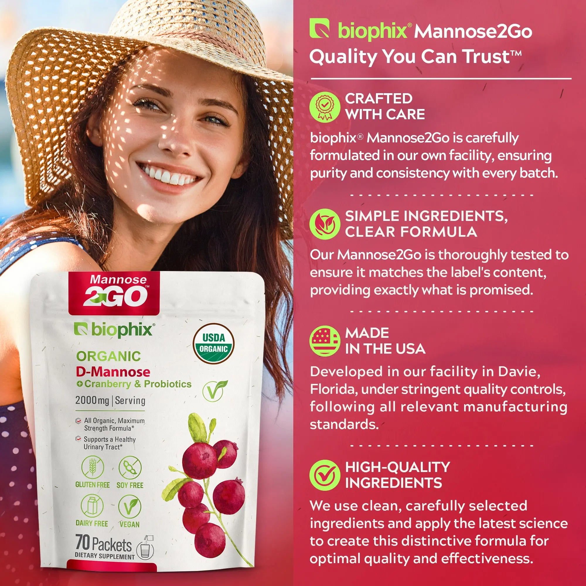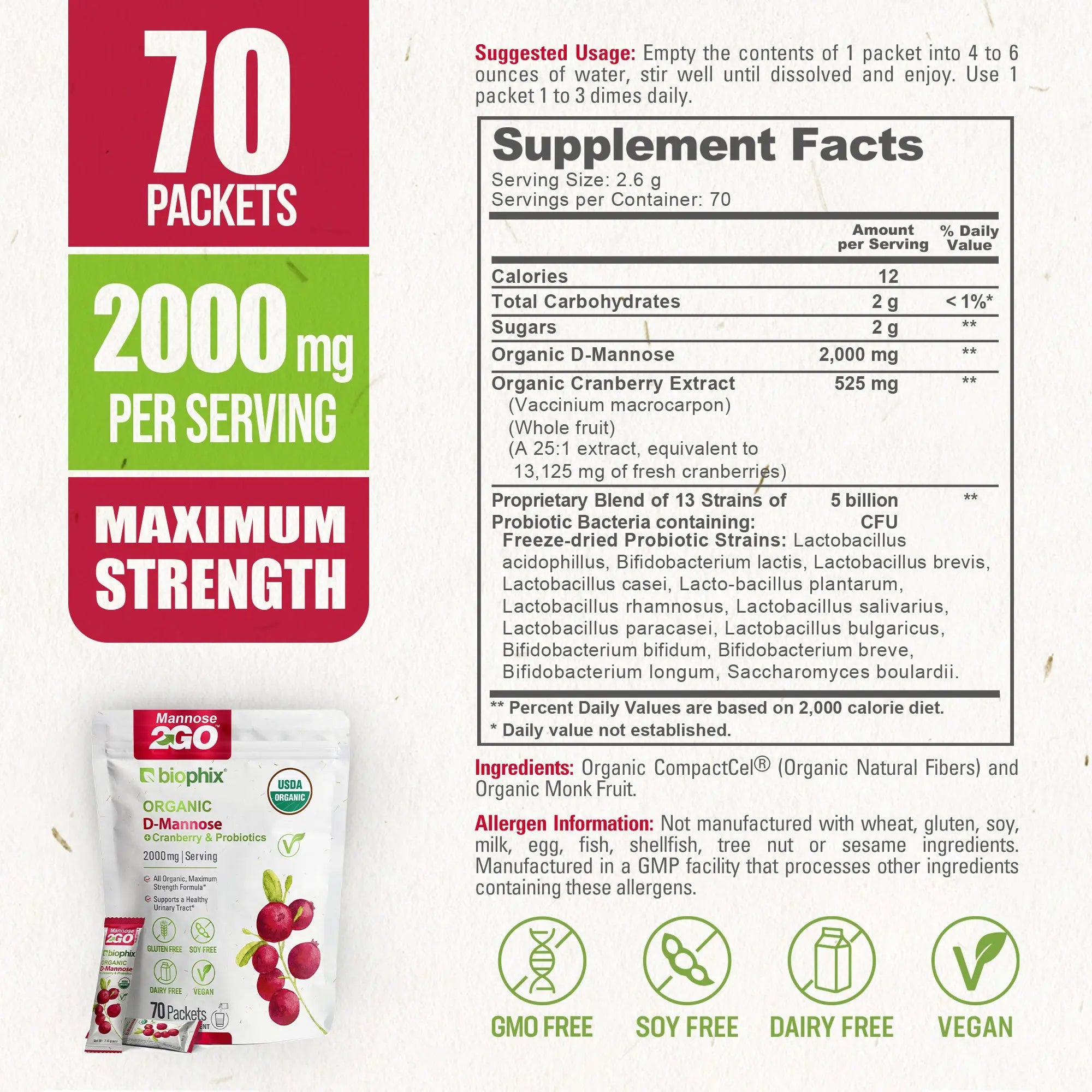 Introducing Mannose2Go packets, your ultimate solution for conveniently taking your daily dose of D-Mannose everywhere you go! Crafted from an organic source of D-Mannose, each convenient packet delivers a full dose of 2000 mg of D-Mannose, fortified with 525 mg of cranberry extract for added support. Harnessing the power of nature, our formula also boasts 5 billion CFU per serving of a potent 13-strain probiotic blend, creating the perfect synergistic effect. We pride ourselves on using only the finest organic ingredients, free from additives and pesticides, ensuring a clean and wholesome product. Manufactured with care in the USA in our own cGMP certified facility, our product is backed by over 25 years of experience and organic certifications, guaranteeing strict quality control measures. Plus, rigorous third-party lab testing ensures purity, potency, and safety, giving you peace of mind with every serving. Gluten-free, soy-free, dairy-free, and suitable for vegans, our formula caters to various dietary preferences and restrictions. Because we believe that everyone deserves access to quality health products, we stand by our commitment to excellence. Trust Mannose2Go for premium quality and unparalleled support for your health journey!